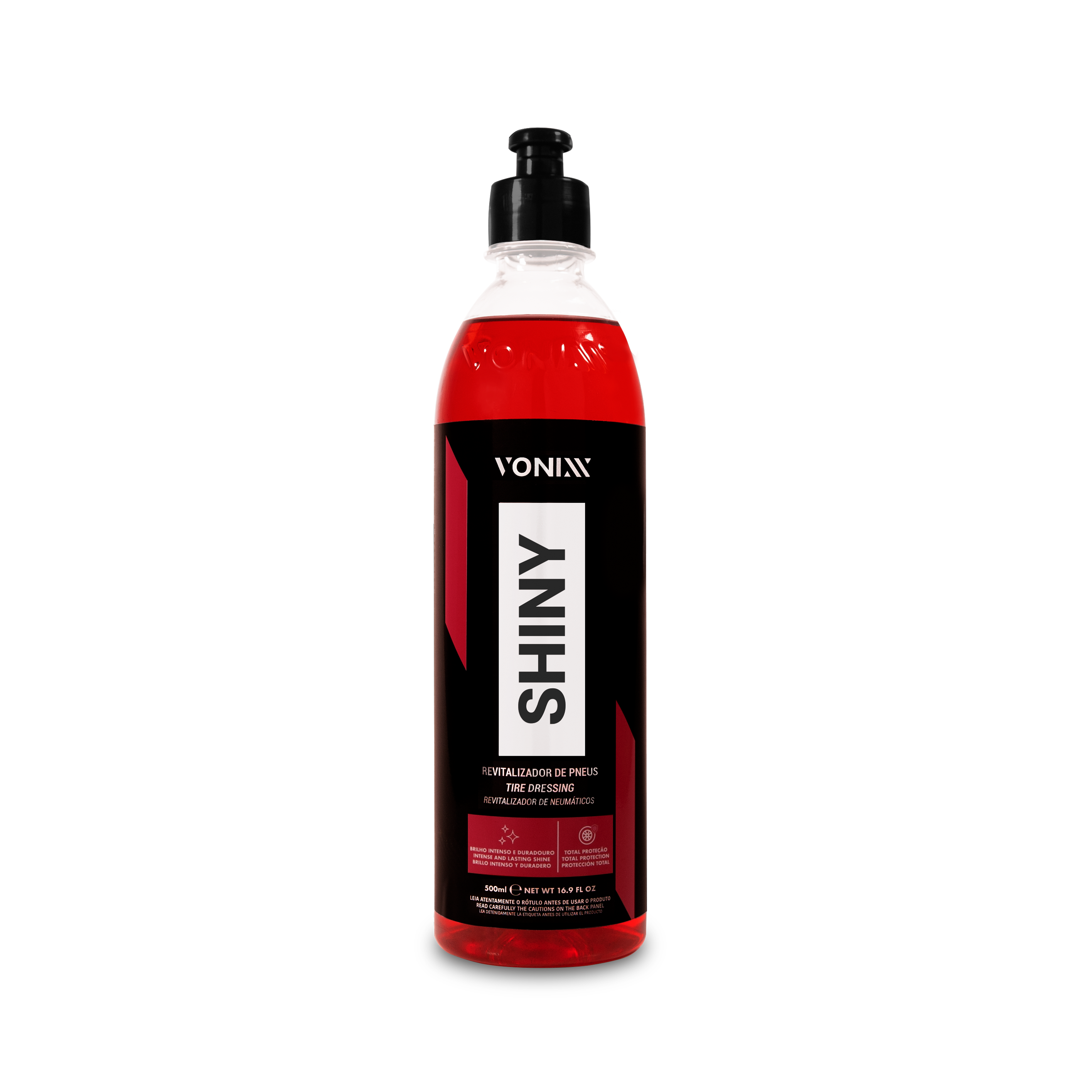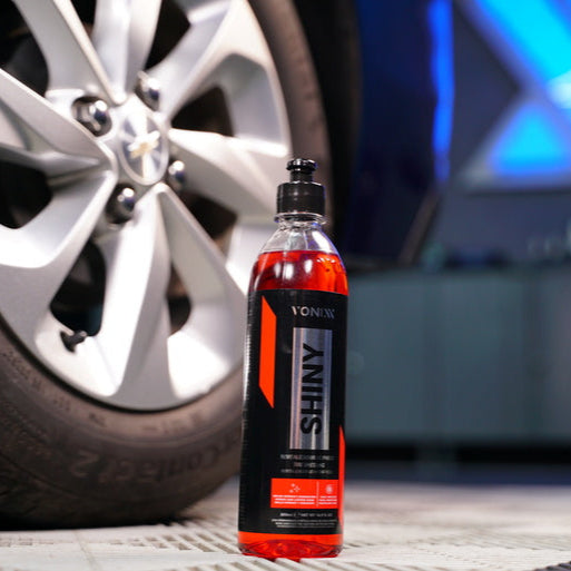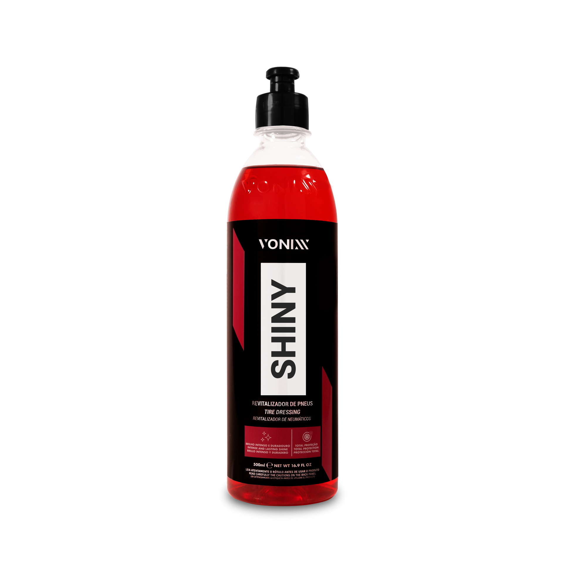 SHINY é um produto desenvolvido exclusivamente para uso em pneus que renova, protege e dá brilho intenso e duradouro aos pneus. O produto não sai ao entrar em contato com a água, podendo alcançar durabilidade de até 60 dias, rende de 15 a 20 aplicações em carros pequenos e mantendo o aspecto no pneu de brilho molhado.