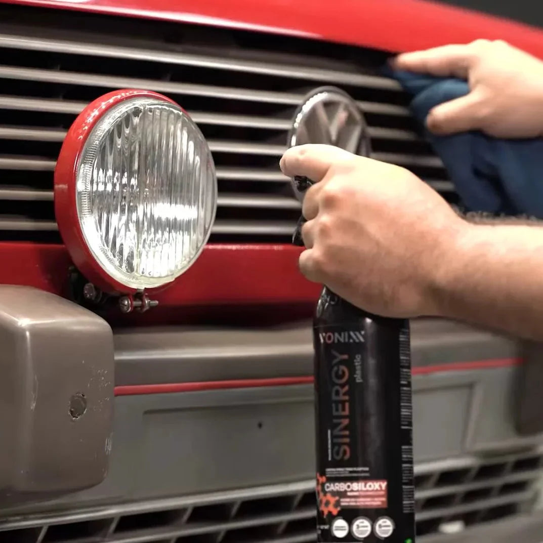 SINERGY PLASTIC SPRAY COATING é um protetor a base dagua, que contém carbono e silício agindo em sinergia para promover proteção de até três anos pláticos internos e cinco meses nos plásticos externos do veículo. A tecnologia CARBOSILOXY, faz com que o carbono presente na composição faça uma dupla fixação do silício no plástico, afim de aumentar a durabilidade.